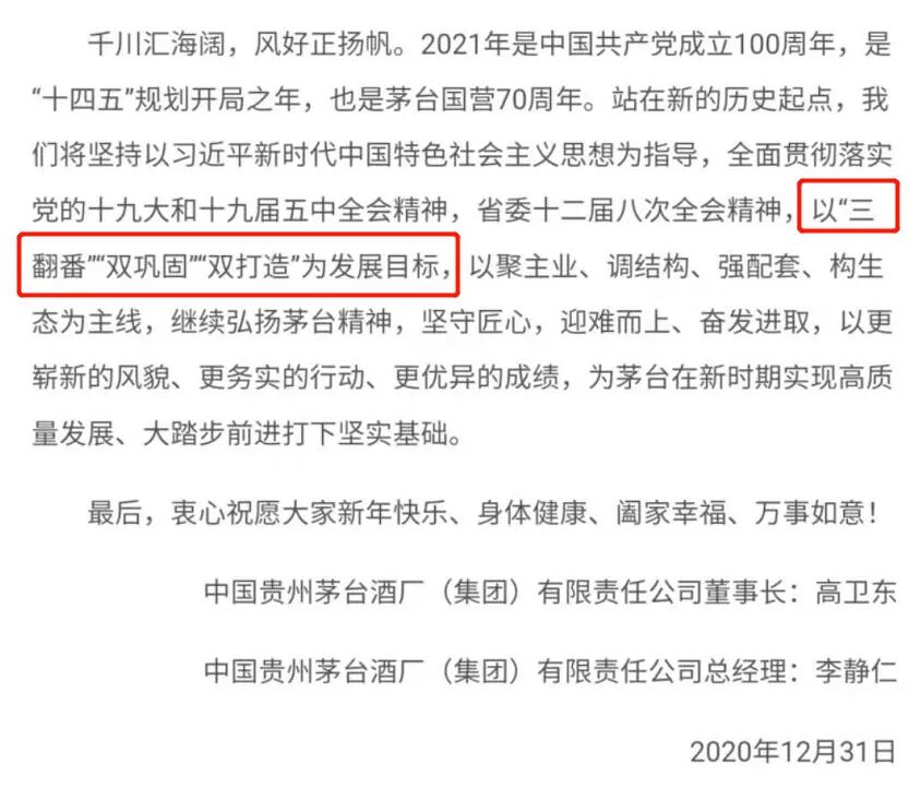 茅台集团在2021年新年贺词中也提出了“三翻番”,即产量、收入和利润翻番。对此,1月4日,国泰君安发布研报称,“十四五”期间预计茅台股份公司收入复合增速有望保持在12%-15%左右,同时在社会渠道与直销渠道协同发展的新营销体系下,未来预计将继续以结构升级、渠道优化释放发展动能,预计吨价有望保持良性增长趋势,利润增速将高于收入增长,增长确定性与稳定性持续凸显。