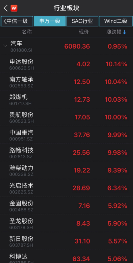 1月13日早盘,汽车板块表现强势,板块内掀起涨停潮。据Wind数据,截至上午收盘,汽车板块涨幅为0.95%;板块内申达股份、南方轴承、郑煤机、贵航股份、中国重汽、路畅科技涨停。