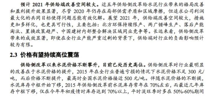 首创证券预计2021年水泥供给端改善空间较大,水泥需求和价格将维持稳定,建议关注结构性和区域性机会,以及公司自身因业务拓展、管理改善、分红增加等带来的个股机会。
