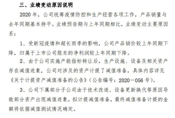 再如天山股份2020年度业绩预告显示,公司2020年盈利14.2亿元至16亿元,同比下降2.19%至13.19%。在业绩变动原因说明中,公司称2020年产品销量与上年基本持平,盈利预减除新冠疫情和超长雨季影响,产品销价同比下降外,还计提了实施产能指标转让后生产设施、设备及相关资产减值,子公司由于技术改造、设备更新换代等原因导致部分资产减值等。
