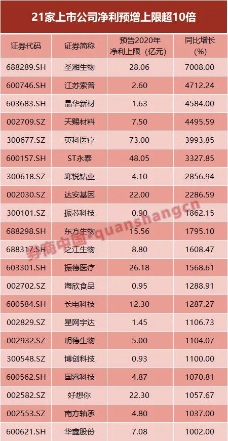 当下正是业绩预告密集披露期。一些上市公司的业绩也是相当喜人。截至1月25日,已经发布业绩预告和业绩快报的上市公司中,有354家公司预告2020年业绩增长上限超过100%。其中21家公司业绩增长上限超过10倍。
