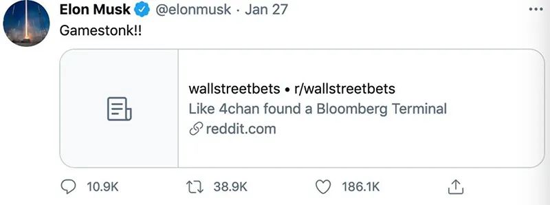 特斯拉CEO马斯克在社交媒体上发帖对游戏驿站的走势表示赞叹。