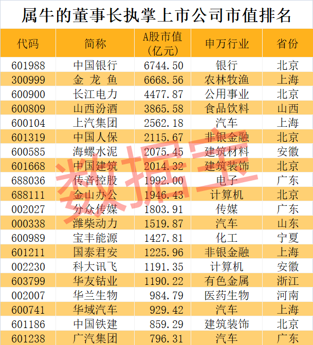 以最新收盘日市值来看,属牛的董事长掌管上市公司总市值达到7.03万亿。掌管公司平均A股市值为254.59亿元,其中16位董事长执掌的公司市值在千亿以上,包括中国银行董事长刘连舸、长江电力董事长雷鸣山、上汽集团董事长陈虹、中国建筑董事长周乃翔、海螺水泥董事长高登榜等。