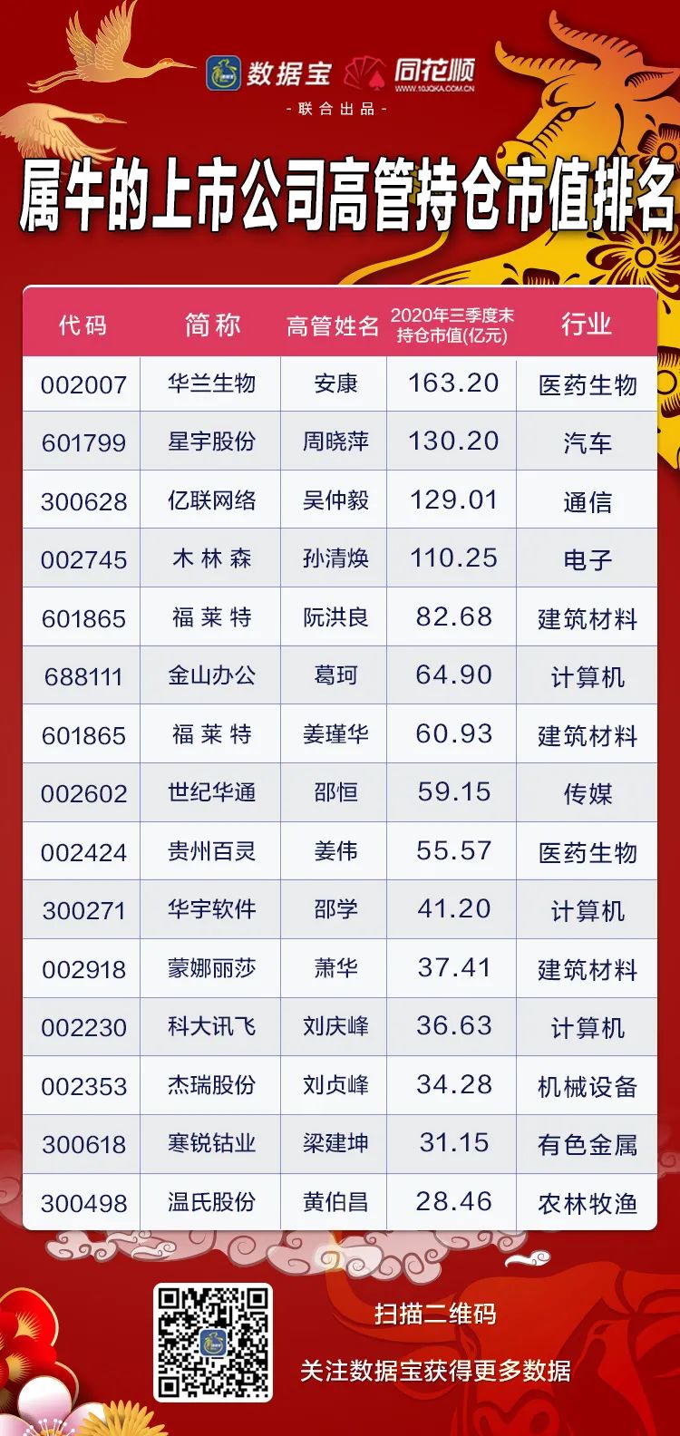 从高管的身价来看(2020年三季度末持股市值),5300位属牛的高管合计持仓市值达到1827.6亿元。4位高管身价超过百亿元,分别是华兰生物安康、星宇股份周晓萍、亿联网络吴仲毅、木林森孙清焕,除吴仲毅外,其余3位均为上市公司董事长。