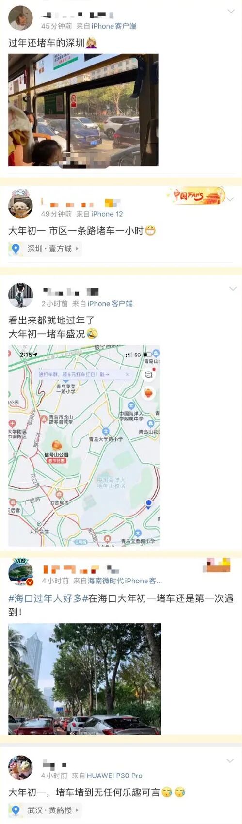 不一样的还有很多大中城市。上海、深圳、西安、海口、青岛到处都是大年初一堵车的信息。
