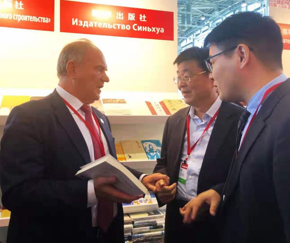 梁相斌(左二)在第32届俄罗斯莫斯科国际书展(MIBF)上向俄罗斯联邦共产党中央委员会主席久加诺夫(左一)介绍新华版图书。