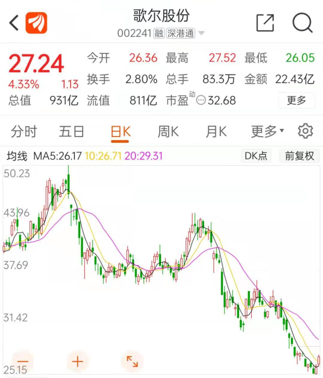 今年以来,受更换财务总监事件、苹果AirPods出货增速放缓等因素影响,歌尔股份股价明显下探。东财Choice数据显示,歌尔股份股价从1月18日收盘的每股43.69元跌至3月26日收盘的每股27.24元,跌幅达37.65%,期间市值从1431亿元跌至931亿元,市值蒸发500亿元。