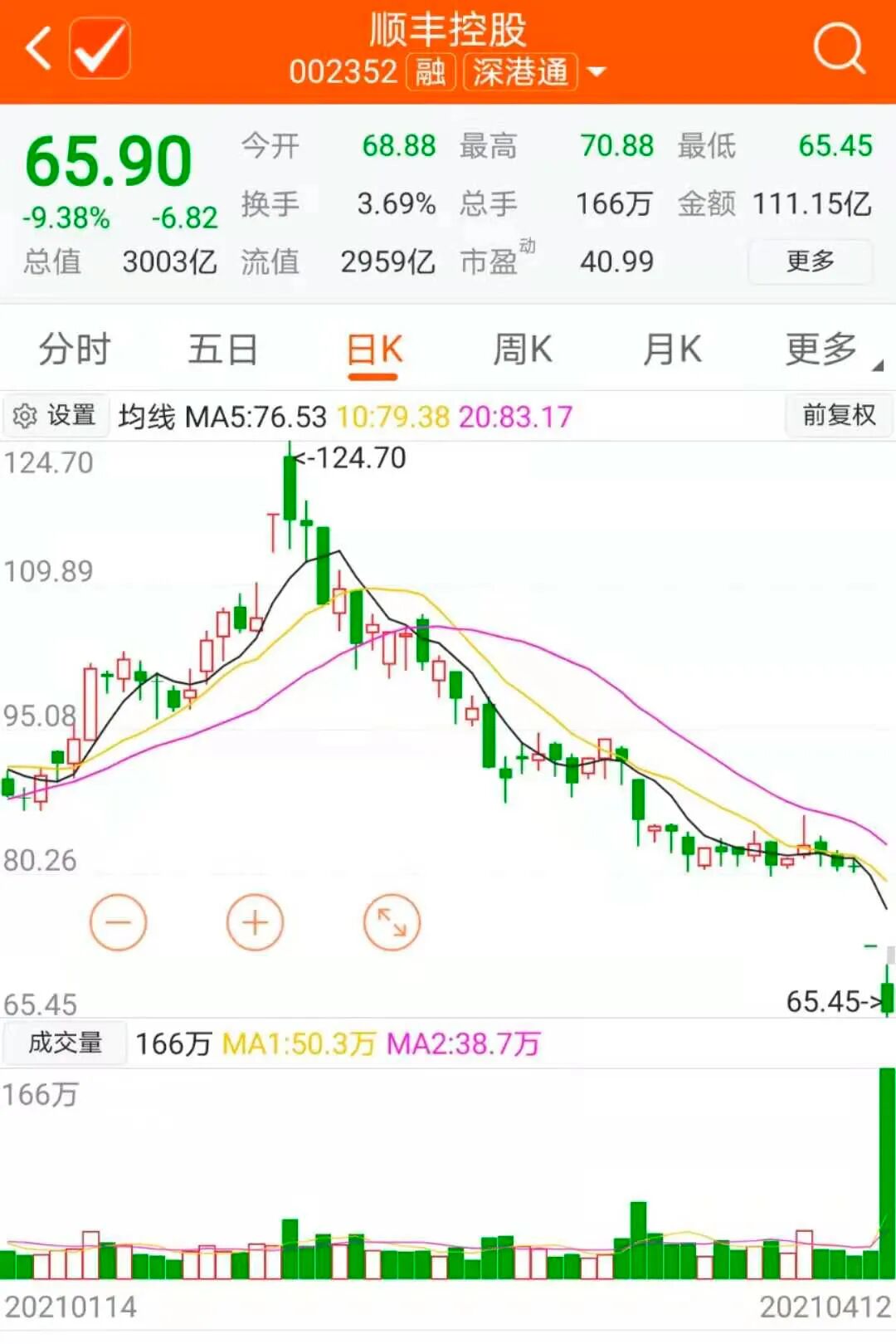顺丰控股今日盘中逼近跌停