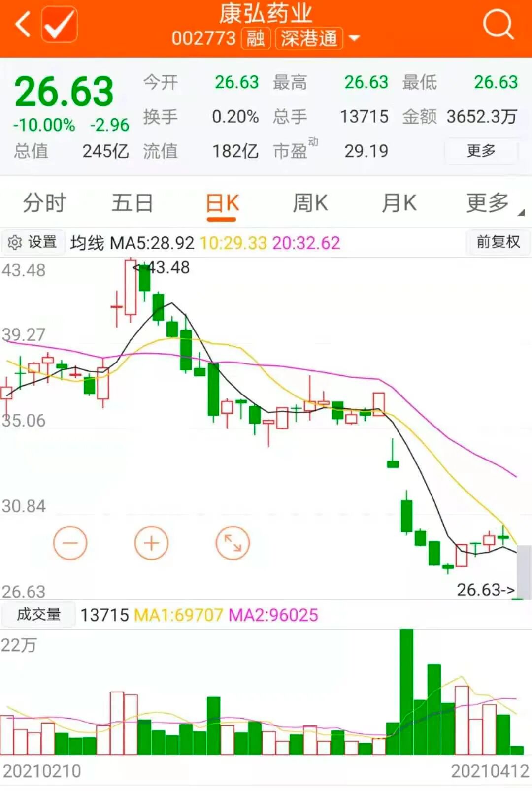创新药公司康弘药业,4月12日一字板跌停
