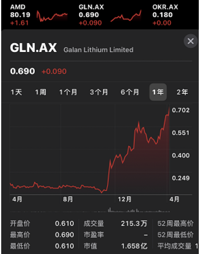 交易软件数据显示,“GLN”为在澳大利挂牌交易的加兰锂业有限公司(Galan Lithium Limited),其股价由2020年11月初的0.11澳元/股涨至目前的0.69澳元/股,涨幅接近700%。