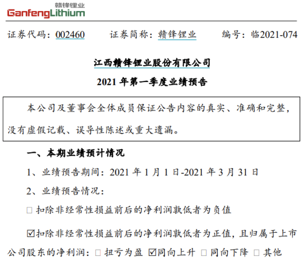 4月14日晚间,赣锋锂业公告,公司预计2021年第一季度归属于上市公司股东的净利润为4.5亿元–5.1亿元,同比增长5709.38%—6483.96%。