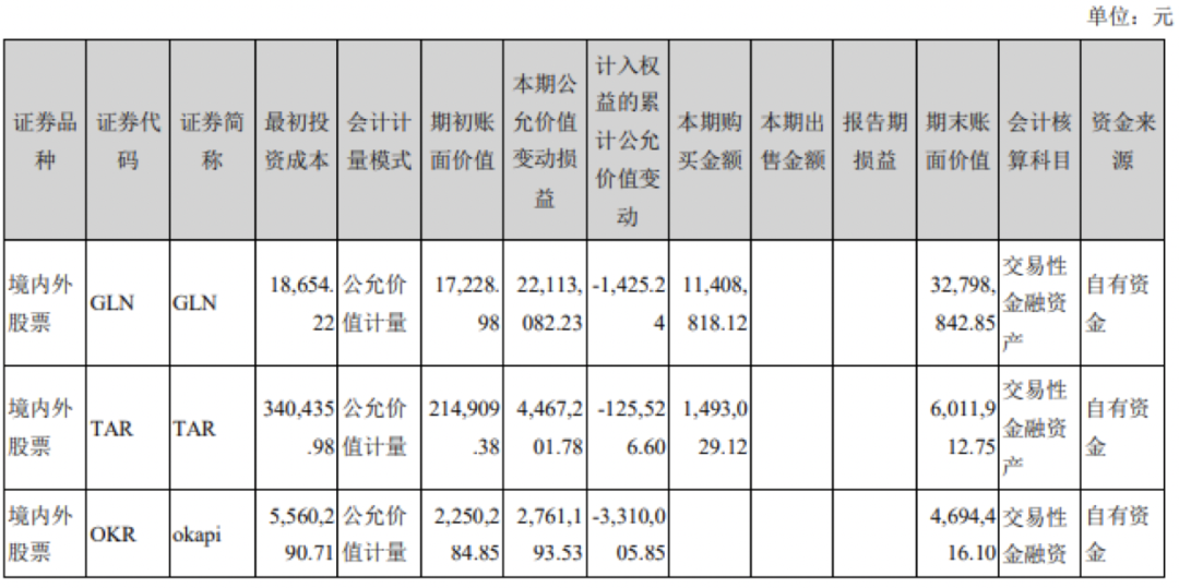 据赣锋锂业2020年年报显示,公司投资了简称为GLB、TAR、OKR、AMD在内的10只证券,而“GLN”这一只股票就带来了超过2200万元的收益。