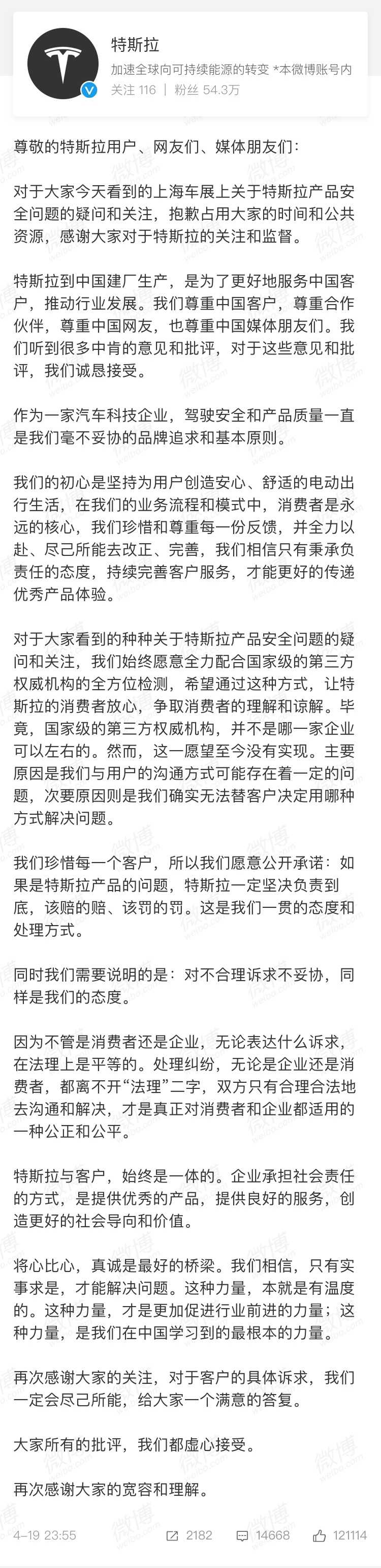可能是因为怕解释得不够清楚,4月19日深夜,特斯拉又在官方微博发了一条长文,并清晰地表明了自己的态度:对不合理诉求不妥协。