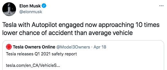 可是在事故发生当天,马斯克才在推特上宣称,使用了自动驾驶仪的特斯拉,发生事故的几率将比普通汽车低10倍。