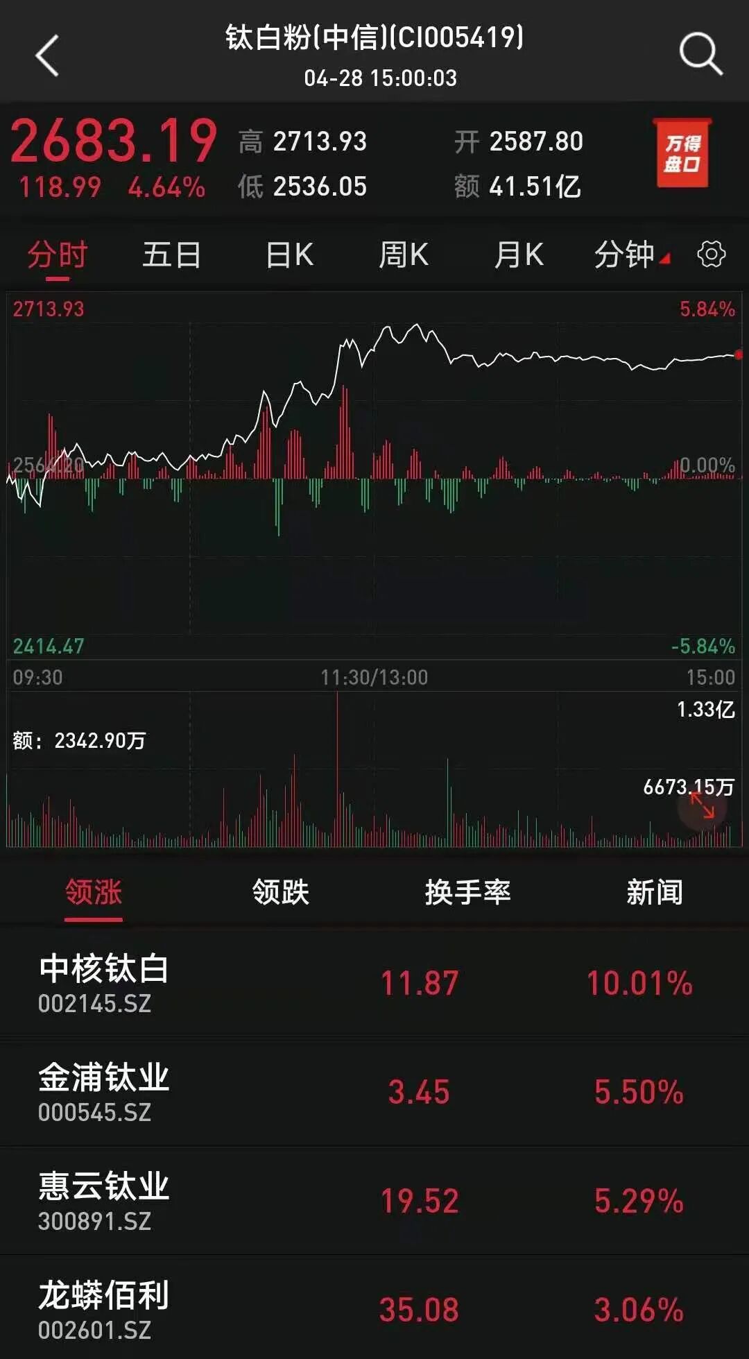 4月28日,钛白粉板块表现强势,中核钛白收盘涨停,惠云钛业、金浦钛业涨幅超过5%,安纳达、龙蟒佰利涨幅超过3%。