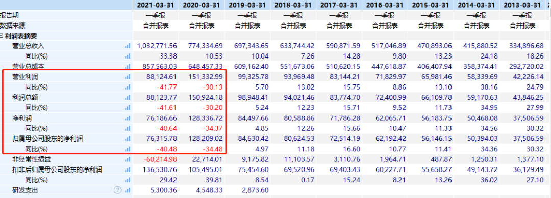 比与2020年的16.69%和2019年的32%,贵州茅台这个一季报盈利增速可以用失速两个字来形容。而且从历史来看,此前贵州茅台只有三年的一季度业绩增速低过10%,分别是2003年、2010年2014年。