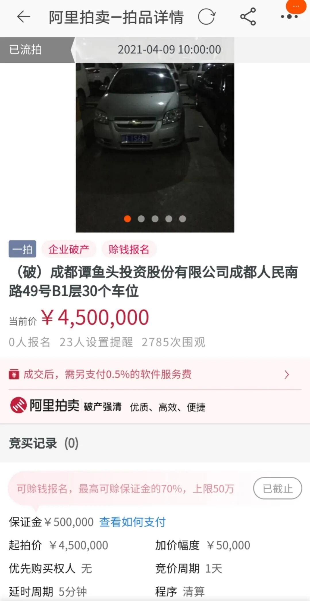 此前,4月9日,成都谭鱼头投资股份有限公司成都人民南路49号B1层30个车位,起拍价450万元,每个车位均价15万,却遭流拍。