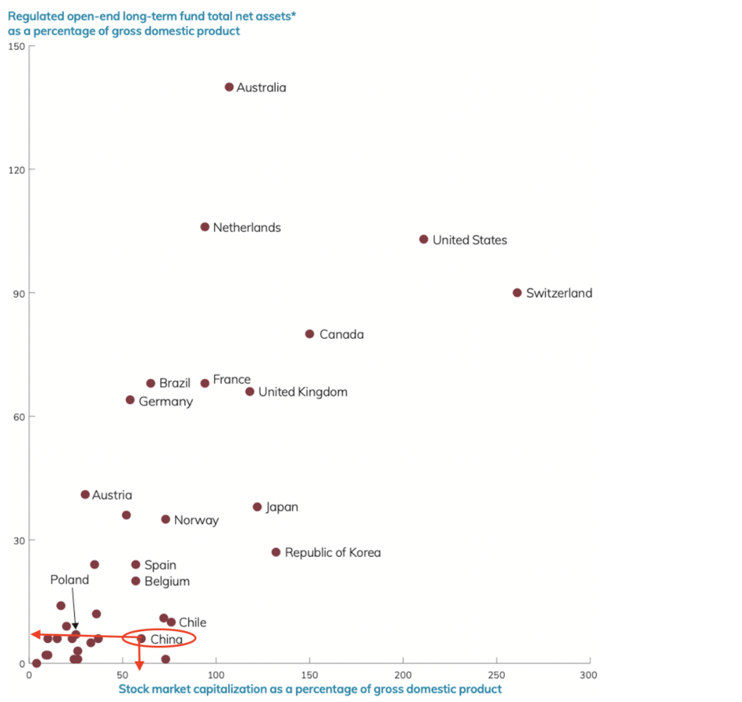 研究表明,基金行业发展与股票市场发展有一定的正相关关系。ICI对全球各个市场统计发现,一个国家受监管的开放式基金中长期限基金(即从受监管的开放式基金中刨去货币市场基金)规模占GDP比例越高,这个国家股市市值占GDP比例往往也越高。