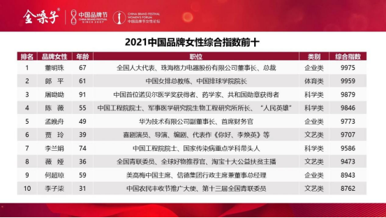 (图为2021中国品牌女性综合指数前十/图源品牌联盟咨询官方微信公众号)
