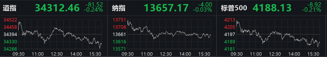 当地时间5月25日,美股三大股指小幅收跌。道指跌0.24%,报34312.46点;标普500指数跌0.21%,报4188.13点;纳指跌0.03%,报13657.17点。
