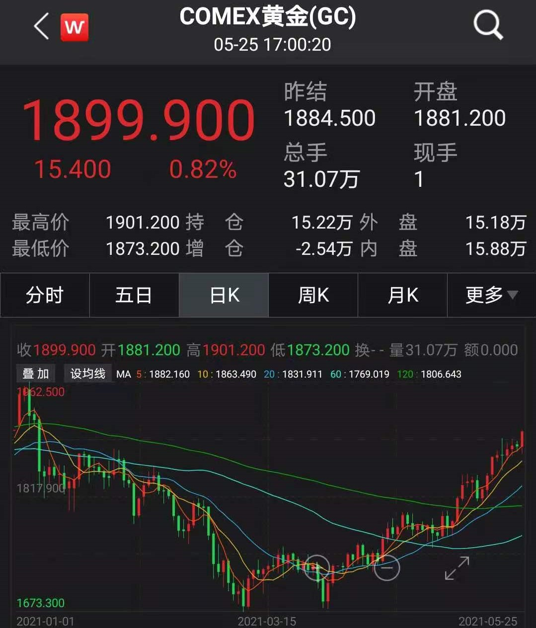 隔夜欧美股市整体表现较为平淡,但在通胀预期升温等因素推动下,国际金价进一步走高。Wind数据显示,截至当地时间5月25日收盘,COMEX黄金期价创下近5个月以来新高,并再度逼近1900美元/盎司的重要关口,黄金现货价格盘中亦一度站上1900美元/盎司。