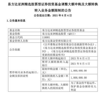 6月3日,易方达基金发布易方达亚洲精选调整大额申购及大额转换转入业务金额限制的公告称,决定从6月4日起,调整易方达亚洲精选在全部销售机构的大额申购、大额转换转入业务金额限制,由“单日单个基金账户累计申购(含定期定额投资及转换转入)的金额不超过1万元”调整为“单日单个基金账户累计申购(含定期定额投资及转换转入)基金的金额不超过100万元”。
