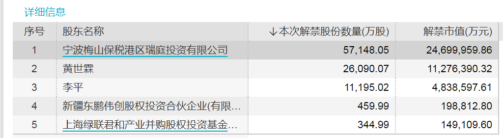 宁德时代6月10日解禁的股份来自于5名股东,分别为瑞庭投资、黄世霖、李平、东鹏伟创投资、绿联君和产业并购股权投资基金合伙企业,截至2021年一季度末,瑞庭投资、黄世霖、李平分列宁德时代第一、第二、第五大股东。在宁德时代下周解禁的5个股东中,瑞庭投资解禁市值达2470亿元,黄世霖解禁市值达1127.64亿元,李平解禁市值达483.86亿元,其他两名股东解禁市值不足20亿元。