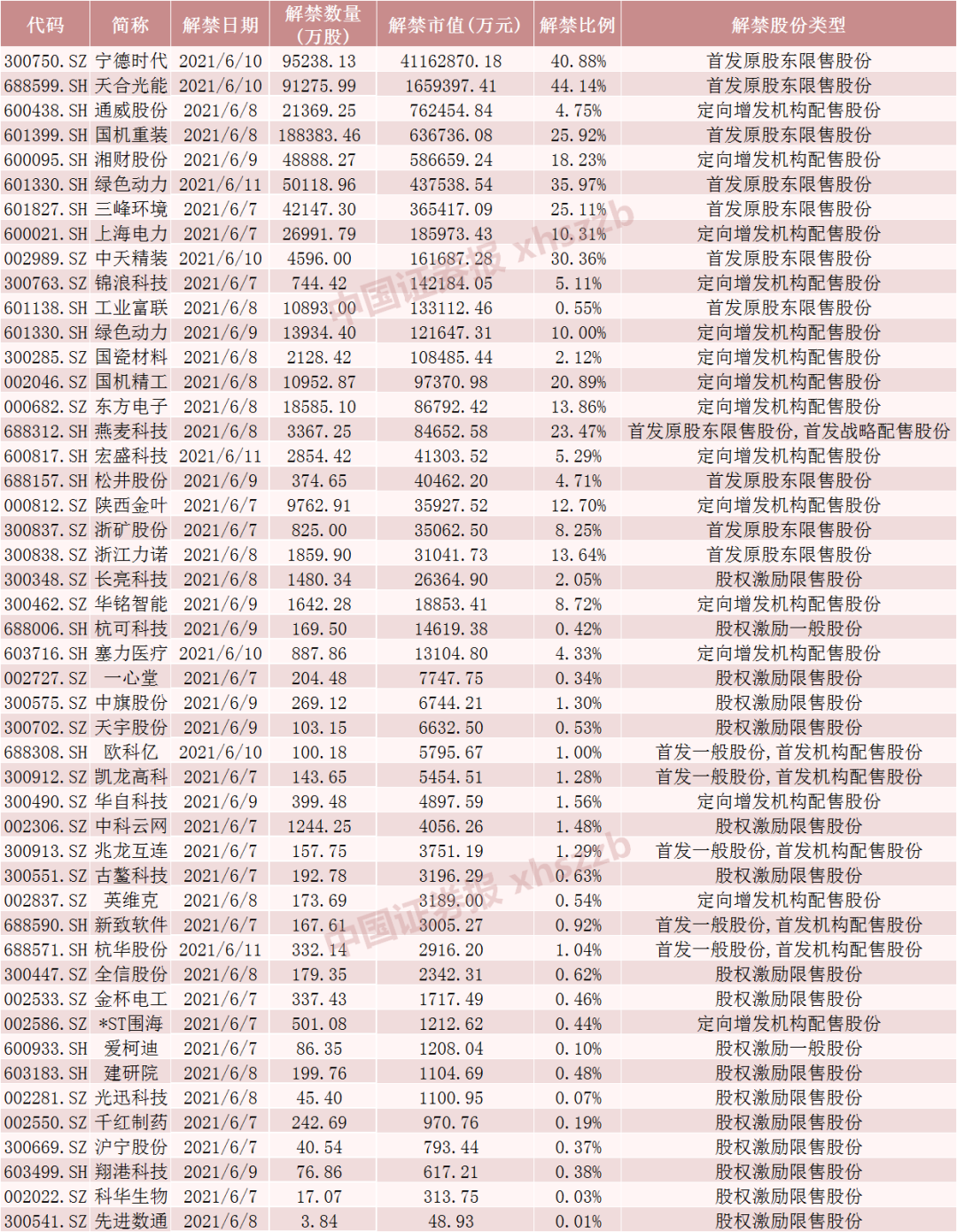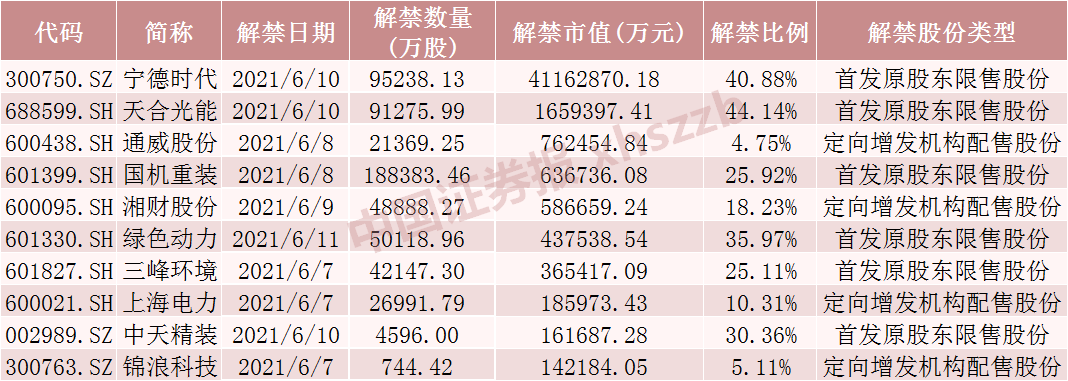 具体来看,宁德时代6月10日将解禁9.52亿股,均为首发原股东限售股份;天合光能6月10日将解禁9.13亿股,均为首发原股东限售股份;通威股份6月8日将解禁2.14亿股,均为定向增发机构配售股份。
