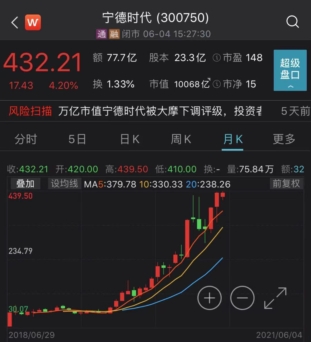 在下周的解禁股中,最值得关注的当属万亿巨头宁德时代。截至目前,宁德时代股价为432.21元/股,总市值为10068亿元,为创业板首只万亿市值个股。4116.29亿元的解禁市值占宁德时代总市值的40.88%,下周解禁后,宁德时代流通盘将大增70.18%。