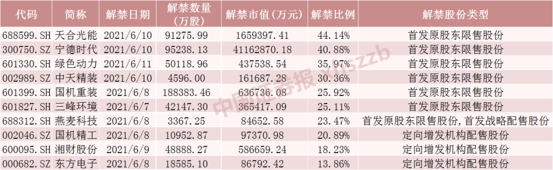 其中,解禁金额最大的为宁德时代,解禁市值为4116.29亿元,天合光能解禁市值逾160亿元。国机重装、天合光能、绿色动力、中天精装、三峰环境、湘财股份、燕麦科技流通盘将增加超100%。