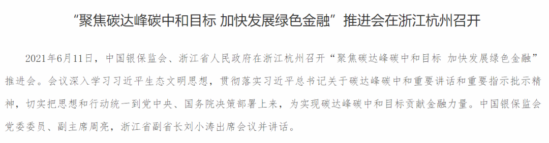 日前,中国银保监会、浙江省人民政府在浙江杭州召开“聚焦碳达峰碳中和目标 加快发展绿色金融”推进会,提出健全规则标准,逐步完善绿色低碳发展和绿色金融领域制度框架。