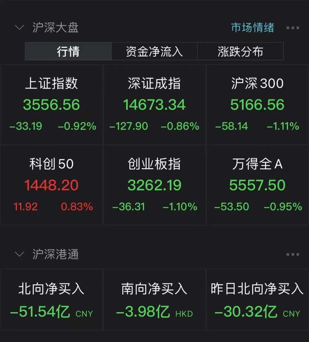 截至收盘,沪指下跌0.92%,报3556.56点;深证成指下跌0.86%,报14673.34点;创业板指下跌1.10%,报3262.19点。