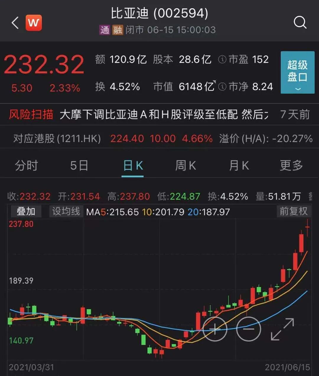 6月15日,比亚迪上涨2.33%,收报232.32元,总市值为6148亿元。5月7日,比亚迪创下今年以来最低收盘价143.95元,较年初高点接近腰斩。但从5月7日至今,比亚迪股价大幅反弹。