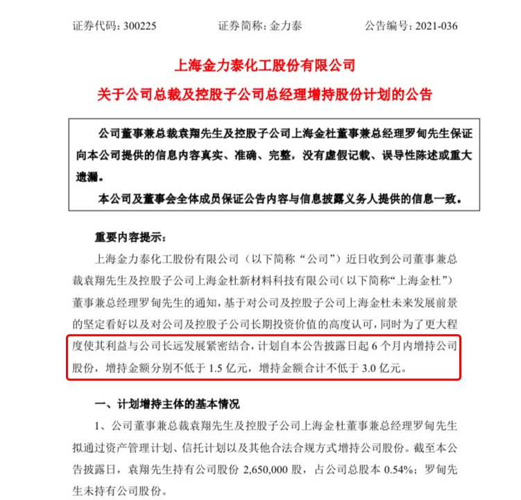 6月14日晚间,金力泰公告,公司董事兼总裁袁翔及控股子公司上海金杜新材料科技有限公司(简称“上海金杜”)董事兼总经理罗甸计划未来6个月内增持公司股份,增持金额分别不低于1.5亿元。