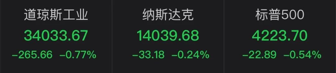 美股三大指数集体收跌,道指跌0.77%,纳指跌0.24%,标普500指数跌0.54%。