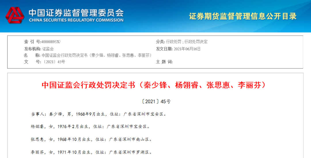 证监会日前发布的一则行政处罚决定书显示,证监会对秦少锋等人内幕交易珠海市乐通化工股份有限公司(以下简称乐通股份)股票行为进行了立案调查、审理,证监会决定:对当事人秦少锋、张思惠处以60万元罚款,对当事人杨翎睿、李丽芬处以60万元罚款。