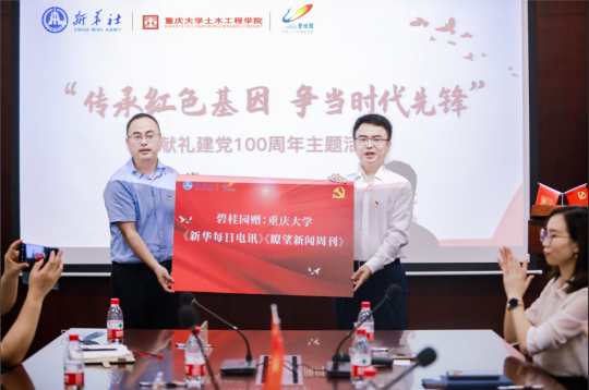 今年是中国共产党成立100周年,为从党的奋斗历史中汲取前进力量,进一步促进校企共建、共同打造学习强国的青年培育氛围。6月22日,碧桂园联合新华社重庆分社共同举办的“传承红色基因,争当时代先锋”献礼建党100周年活动暨新华社重点社办报刊进校园捐赠仪式在重庆大学土木工程学院举行。