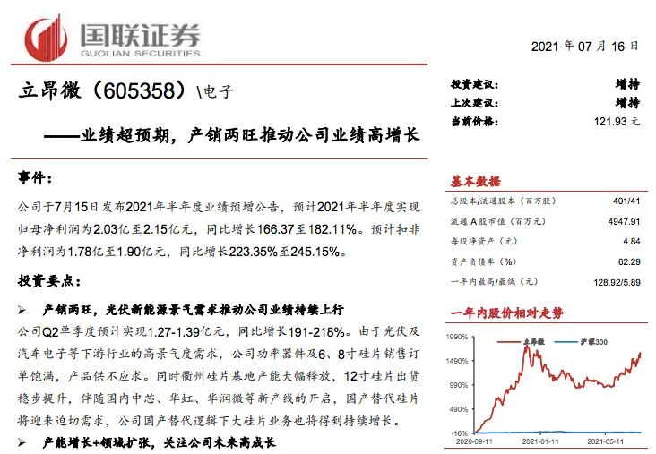 立昂微曾在一季报中预计上半年净利润将同比增长100%以上。而公司半年度业绩预告显示,预计上半年将实现净利润2.03亿元至2.15亿元,同比增长166.37至182.11%。