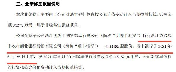 公告显示,明牌珠宝对瑞丰银行投资按公允价值变动计入当期损益核算,影响金额约3.43亿元。据悉,明牌珠宝全资子公司明牌卡利罗,持有瑞丰银行约5863.84万股股份,瑞丰银行于今年6月25日上市。
