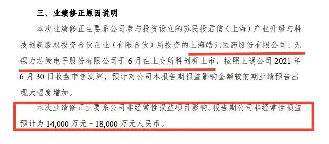 上半年,柘中股份参与投资设立的苏民投君信(上海)产业升级与科技创新股权投资合伙企业(有限合伙)所投资的皓元医药、力芯微于6月在科创板上市。按照上述公司6月30日收盘市值测算,预计对公司本报告期损益影响金额较前期业绩预告出现大幅度增加。