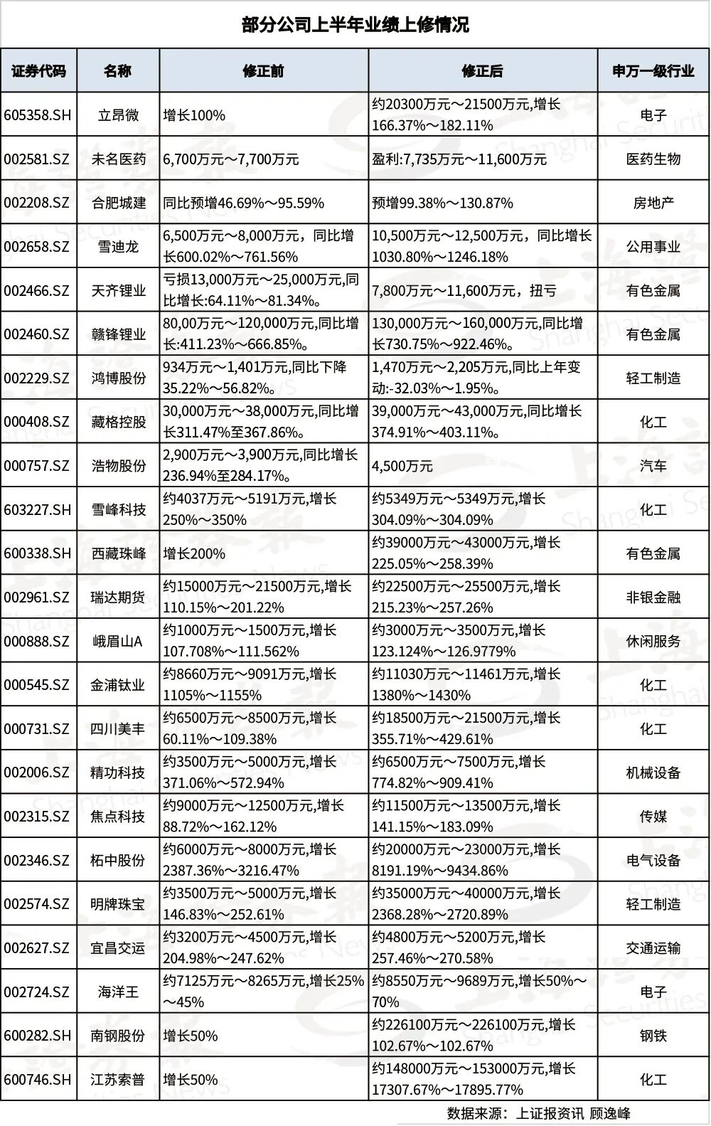 要么主业好,要么投资强。据上证报资讯统计,6月份至今已有立昂微、未名医药、合肥城建、雪迪龙、天齐锂业、赣锋锂业、鸿博股份、藏格控股、浩物股份、雪峰科技等逾20家A股公司上修了今年半年报预增幅度。