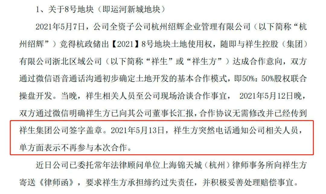 根据回复函披露,在由全资子公司杭州绍辉竞得前述8号地块土地使用权后,宋都方随即与祥生控股达成合作意向,拟50%:50%股权联合操盘开发。5月12日,双方通过微信明确祥生方已向其公司董事长汇报,合作协议无需修改并已经传到祥生集团公司签字盖章。