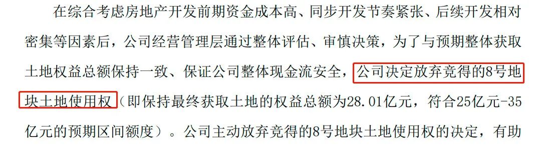 公司表示,这导致公司在极短时间内无法达成其他商业合作机会,给公司短期内的资金安排带来巨大压力。在综合考虑房地产开发前期资金成本高、同步开发节奏紧张、后续开发相对密集等因素后,为了与预期整体获取土地权益总额保持一致、保证公司整体现金流安全,公司最终决定“忍痛割爱”。