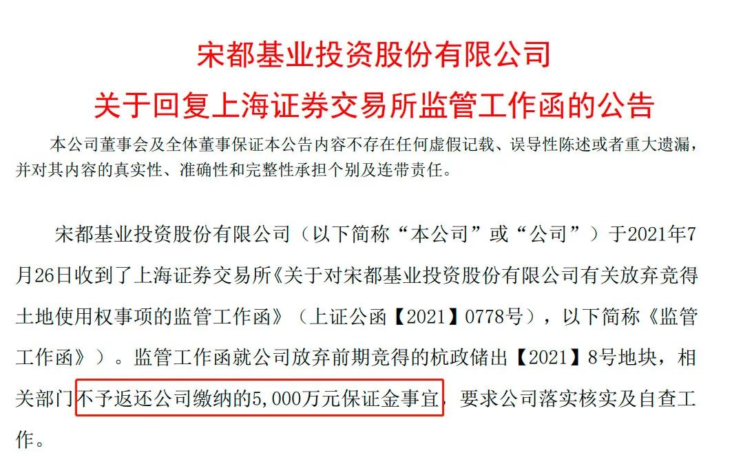 昨晚,宋都股份一封监管函回复道出原委:由于合作伙伴“不讲武德”、临时变卦,导致公司短期资金承压,无奈认亏退地。