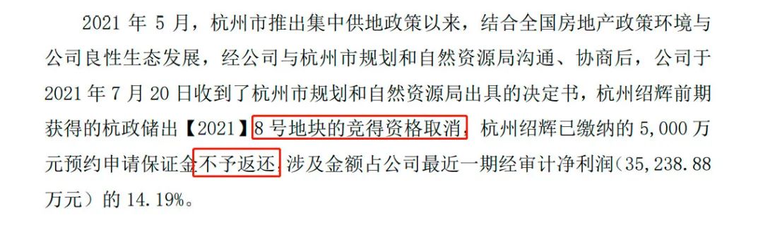 7月21日,宋都股份发布公告,宣布放弃其在5月7日杭州首批集中供地中竞得的杭政储出【2021】8号地块土地使用权,并将因违约损失5000万元的预约申请保证金。这一数额占其去年全年净利润的14.19%。
