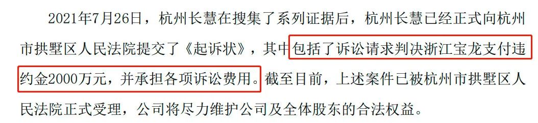 7月26日,杭州长慧向杭州市拱墅区人民法院提交了起诉状,其中包括诉讼请求判决浙江宝龙支付违约金2000万元,并承担各项诉讼费用。目前,上述案件已被法院正式受理。