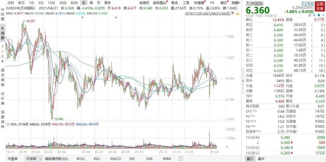 股价上,截至8月12日,万洲国际港股股价报6.36港元,近两年来均徘徊在6.5港元附近,持续低迷。双汇发展的股价则一路下跌,从2020年8月底61元/股的高位下跌至目前的27.24元/股,跌幅超过50%,股价“腰斩”。