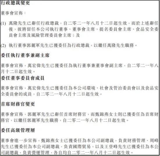值得一提的是,万洲国际12日的公告中,还宣布了多项高管任职,却唯独没有万隆长子万洪建的身影。而现年47岁的万隆次子万宏伟,“升职”执行董事兼董事会副主席,此前为行政总裁助理,负责公共关系。