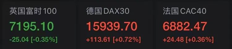 欧洲三大股指涨跌不一。英国富时100指数跌0.35%报7195.10点;法国CAC40指数涨0.36%报6882.47点;德国DAX指数涨0.72%报15939.70点。