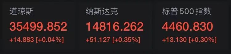 美股小幅上扬,道指与标普指数再创盘中与收盘历史新高。据统计,这也是年内标普500指数第47次刷新历史新高。道指涨0.04%报35499.85点;纳指涨0.35%报14816.26点;标普500指数涨0.30%报4460.83点。